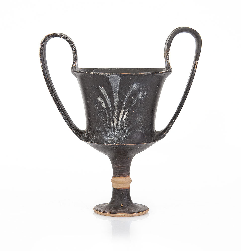 KANTHAROS APULO IN TERRACOTTA VERNICIATA, MAGNA GRECIA, V-IV SECOLO A.C., a calice con alte anse piatte, piede con stelo circolare, decoro dipinto in nero e a motivi fitomorfi bianchi; usure.