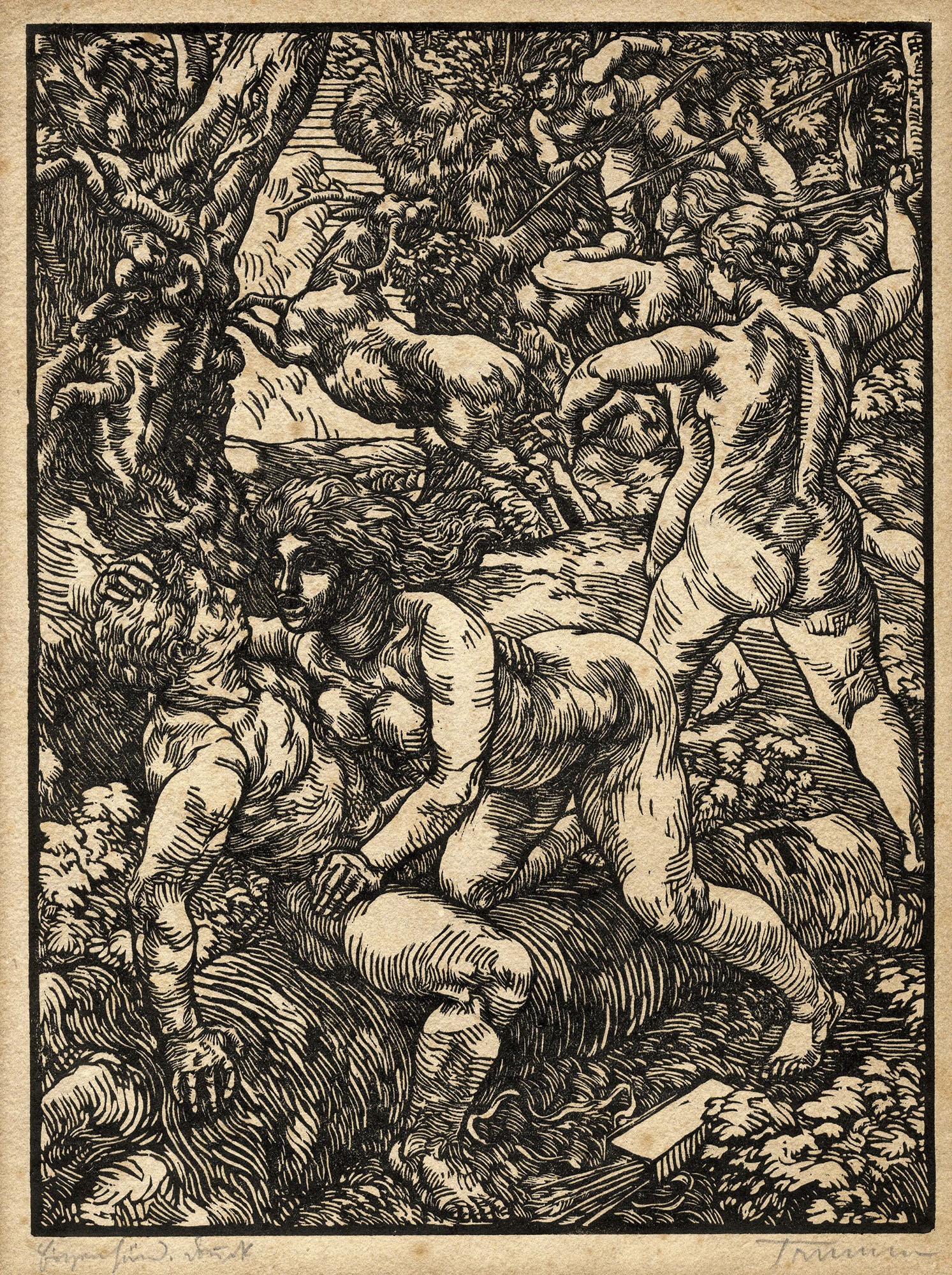 Peter Trumm, Scena mitologica. 1922. Xilografia su carta pesante. mm 327x245....