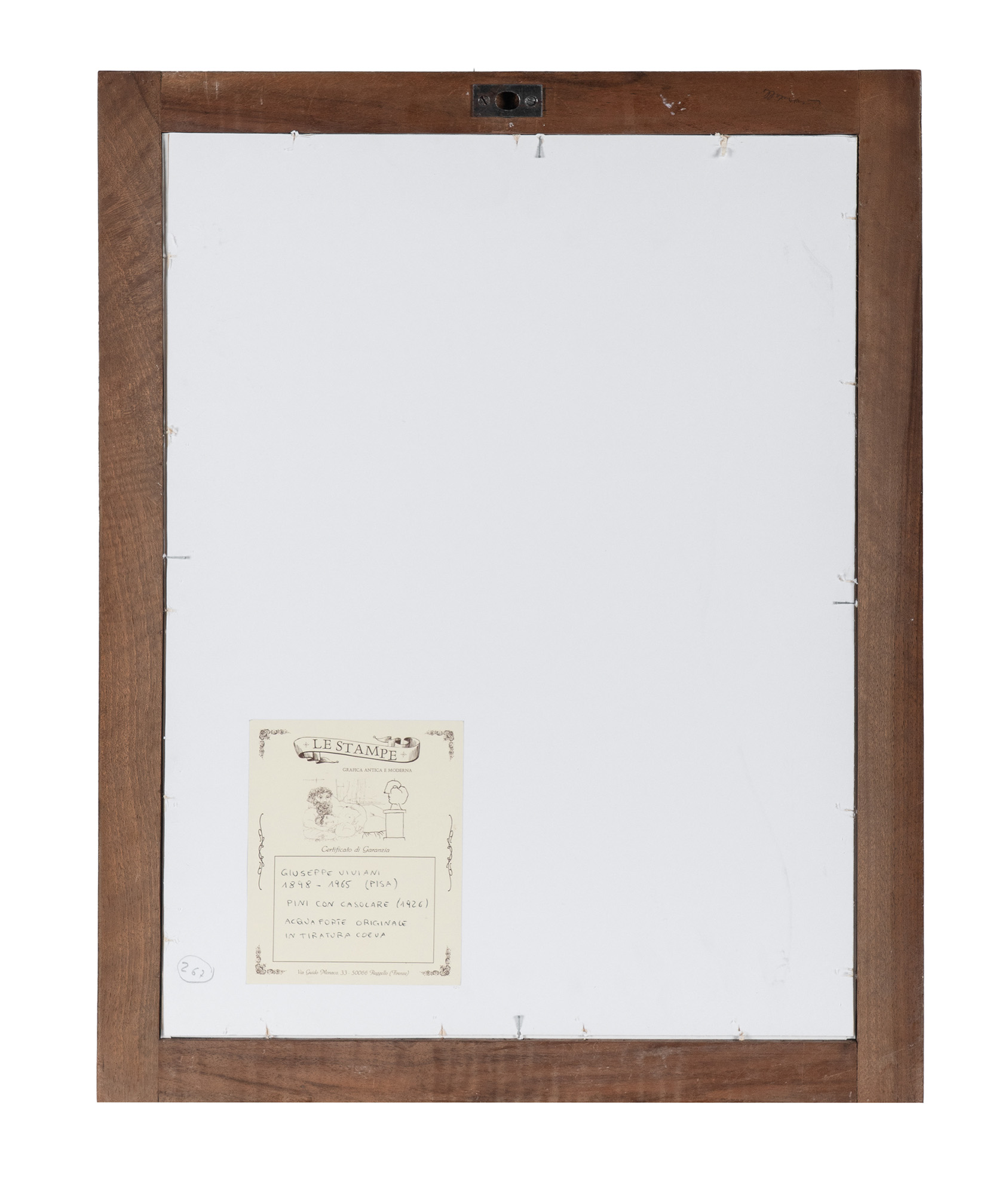 Acquaforte. mm 370x246. Foglio: mm 506x387. Firma a matita in basso a destra e tiratura in basso a sinistra. Al verso del supporto della cornice è applicata l'autentica de Le Stampe, sulla quale però è riportata la data del 1926 invece che del 1927. Es. IV/1927. (1) In cornice di legno: cm 58,7x46,5. Leggeri difetti ai margini, impressione corposa e perfetta, con inchiostrazione brillante.