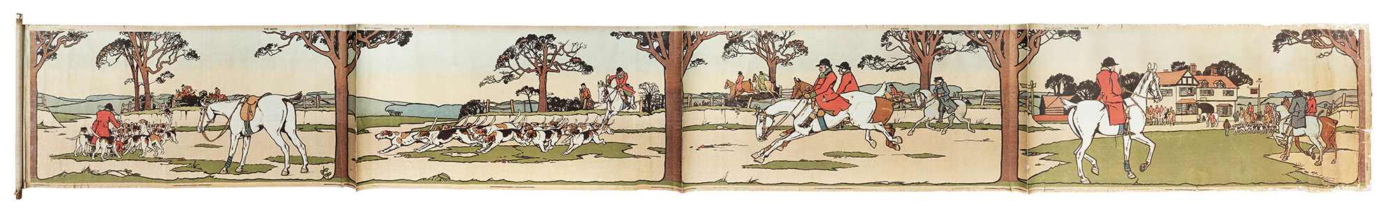 Arazzo xilografico a più legni con ritocchi a tempera su carta. mm 810x6400 (aperto). Composto da 4 pannelli (ognuno mm 810x1600) applicati a tela arrotolata su asse di legno. Ogni pannello reca al margine superiore un codice identificativo e il titolo: The Meet (l'incontro), Come Away (la partita), Full Cry (inseguimento) e The Death (la morte). (1) Strappetti marginali, più accentuati sull'ultimo pannello. Pieghe e crepe verticali in prossimità della giunzione dei singoli pannelli.