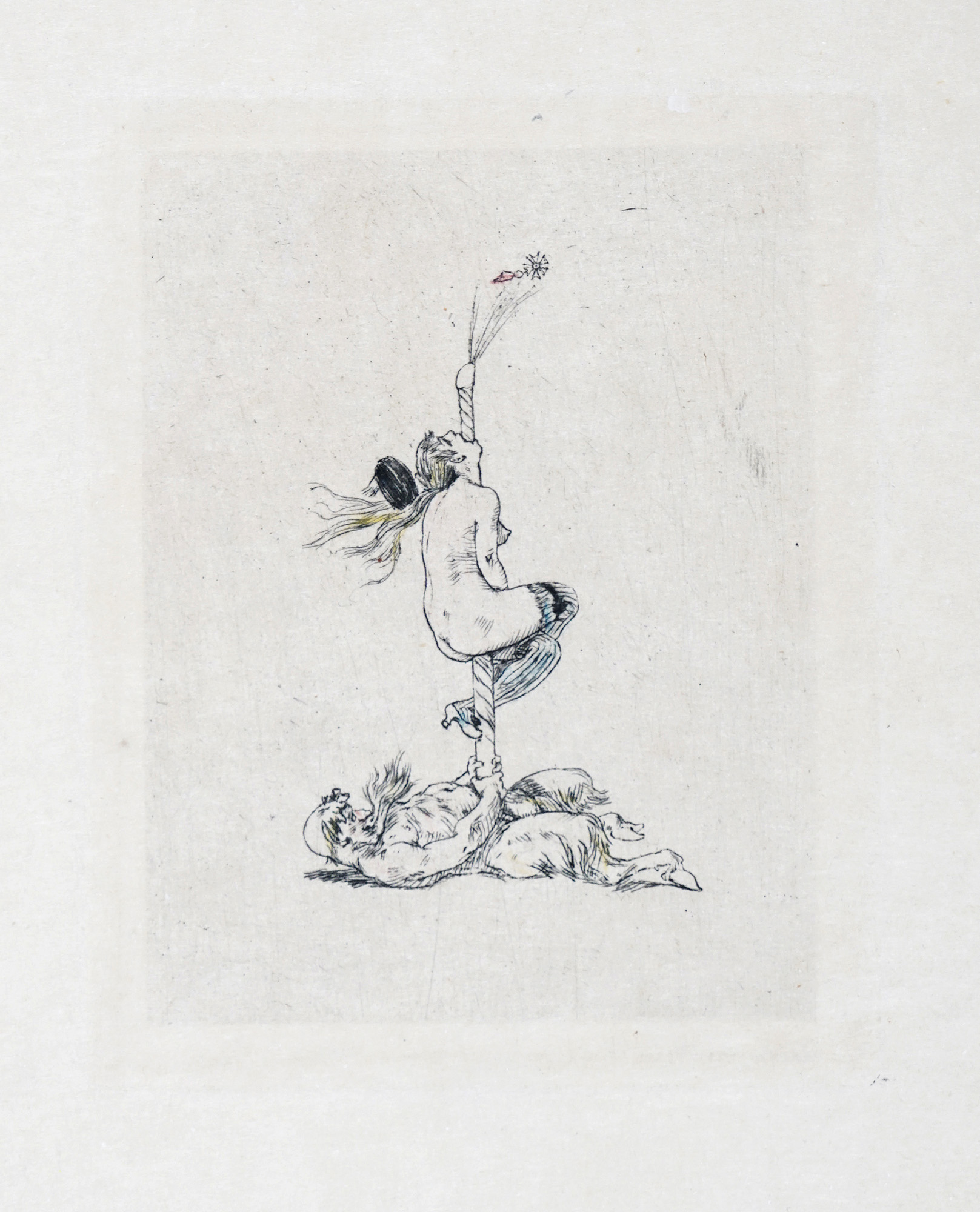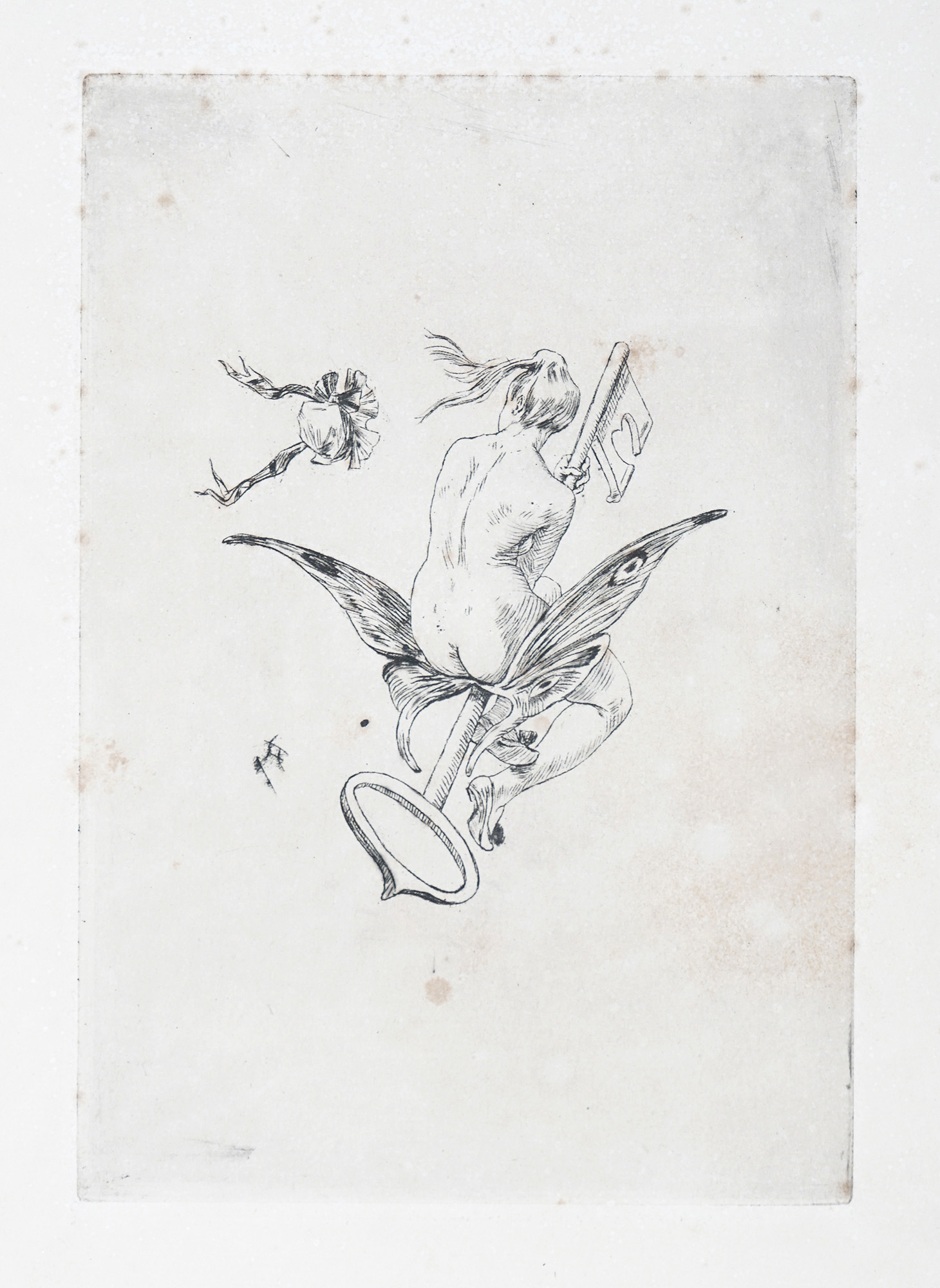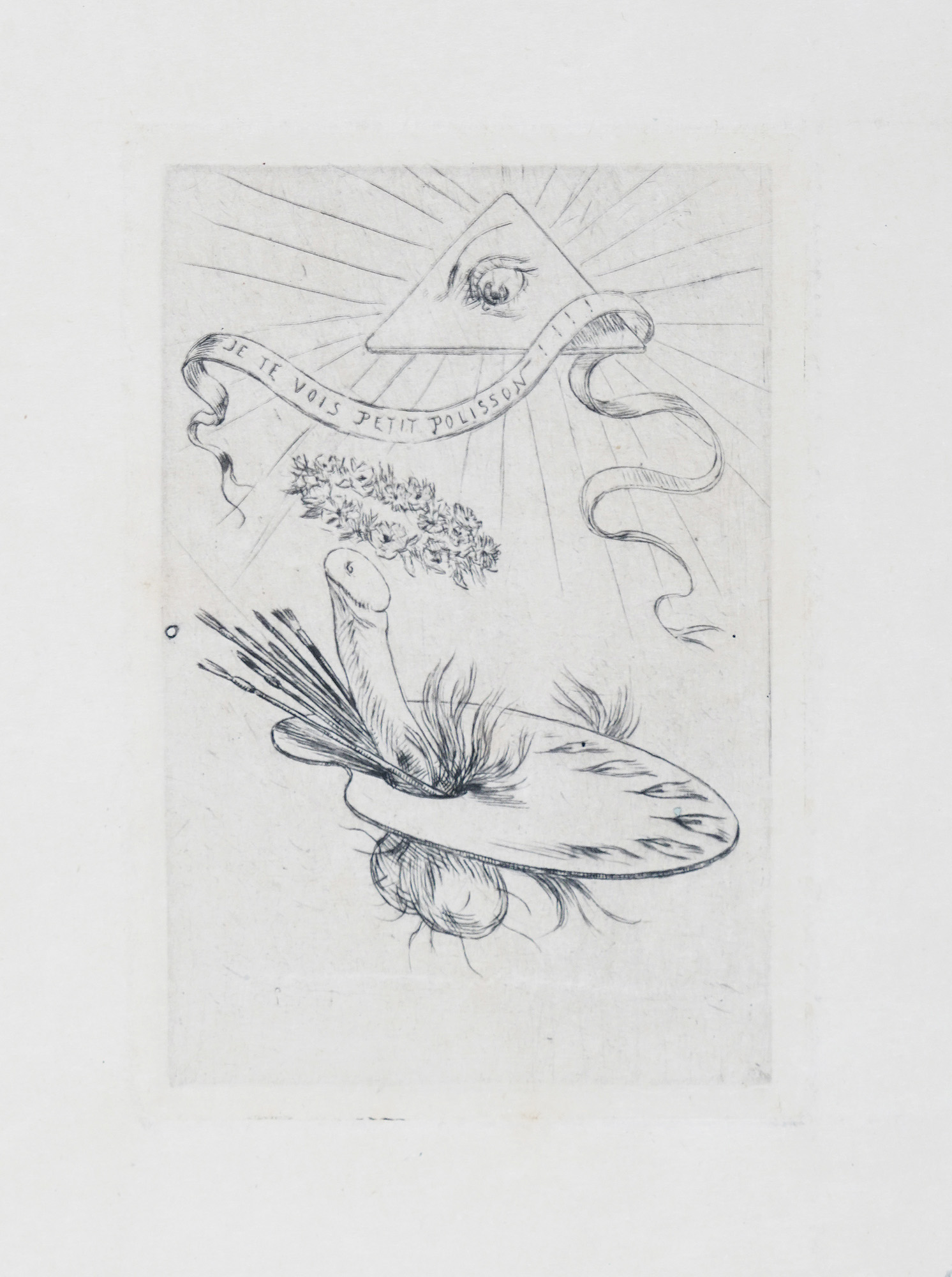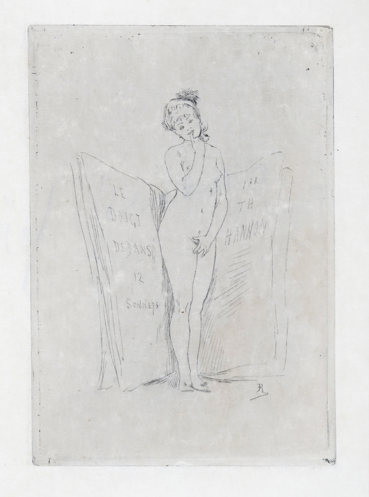 1) La peinture erotique. Puntasecca su carta Giappone. mm 120x80. Foglio: mm 550x350. "Je te vois petit polisson!!!" in lastra in alto al centro. Appunti di collezione a matita sul passe-partout. 2) Le doigt dedans 12 sonnets par Th. Hannon. Puntasecca su carta Giappone. mm170x118. Foglio: mm 533x340. Monogrammata in lastra in basso a destra. Titolata a china bruna in basso a destra. Appunti di collezione a matita sul passe-partout. 3) La clef de champs. Acquaforte su carta vergellata con filigrana. mm 185x127. Foglio: mm 500x325. Monogrammata in lastra a sinistra. Titolo a matita in basso a destra. Appunti di collezione sul passe-partout. 4) La vrille. Puntasecca su carta Giappone. mm 115x90. Foglio: mm 358x260. Titolo a matita e "Stato definitivo" a matita in basso a destra. Appunti di collezione sul passe-partout. (4) Alcune imperfezioni e difetti in lastra su due fogli. Buona conservazione complessiva.