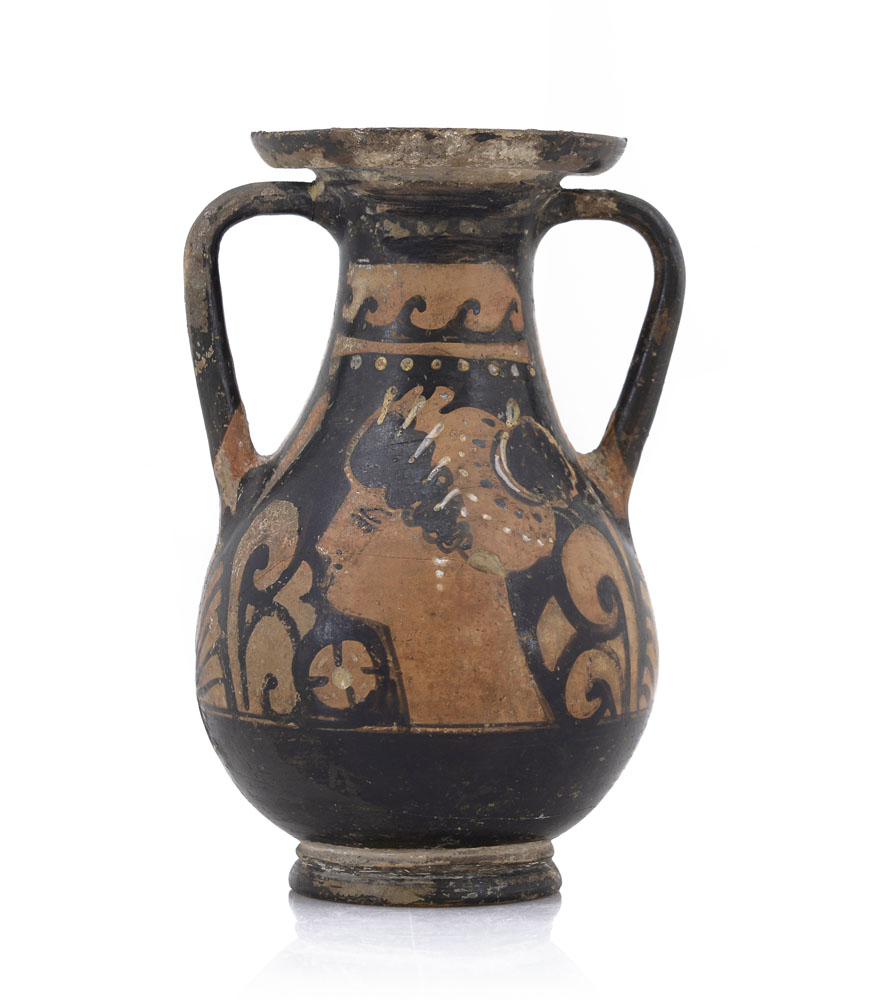 PELIKE APULA A FIGURE ROSSE IN TERRACOTTA VERNICIATA, IV SECOLO A.C., piriforme biansata con labro svasato, decoro con profilo femminile e orlature ad onde; ricomposta da elementi.