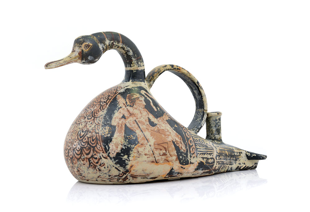 ASKOS IN TERRACOTTA VERNICIATA A FIGURE ROSSE, IV SECOLO A.C., corpo a forma di papera con ansa orizzontale applicata, decoro con figura entro riserve; restauri e usure.