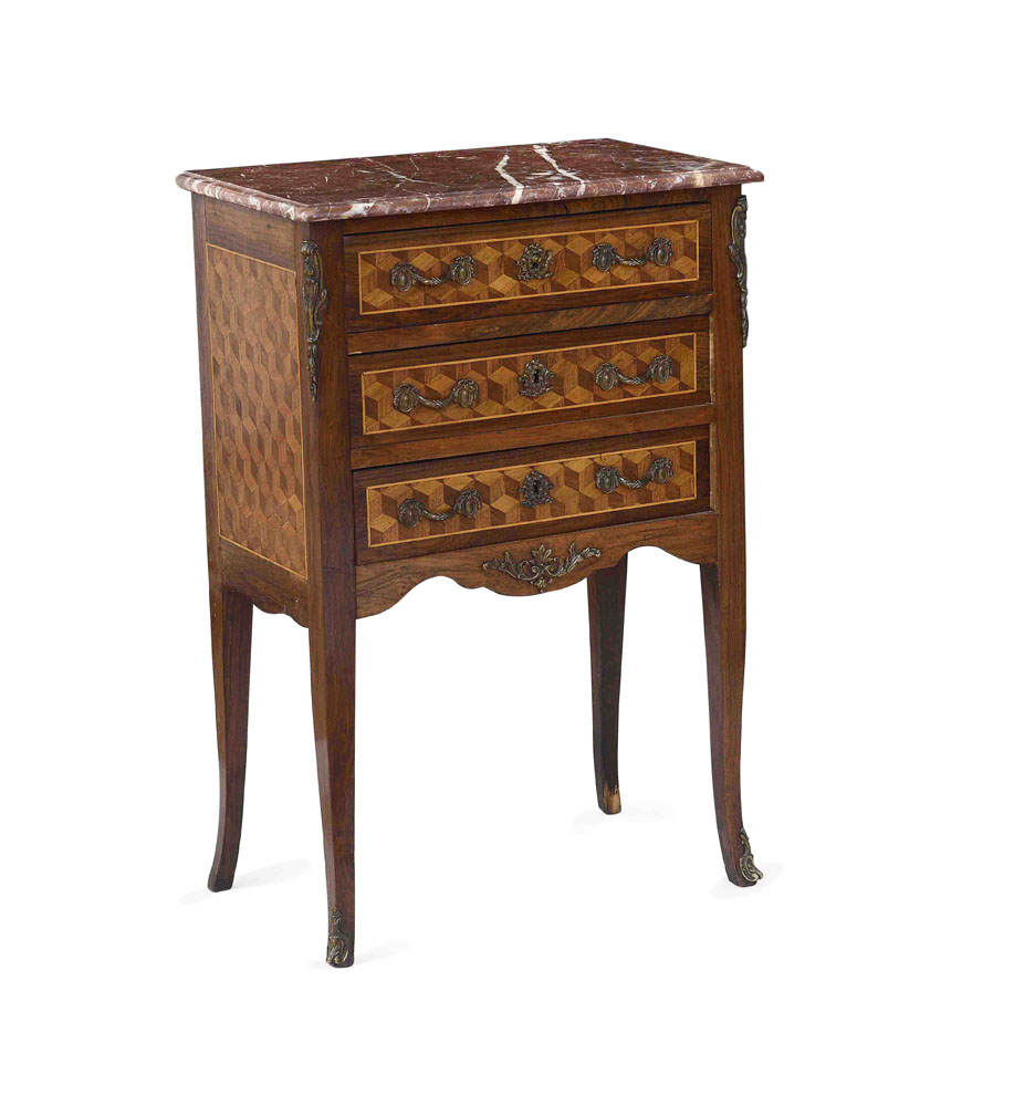 PICCOLO CASSETTONE INTARSIATO, FINE XIX SECOLO, fronte a tre cassetti e piano in marmo, decori losanghe; usure.