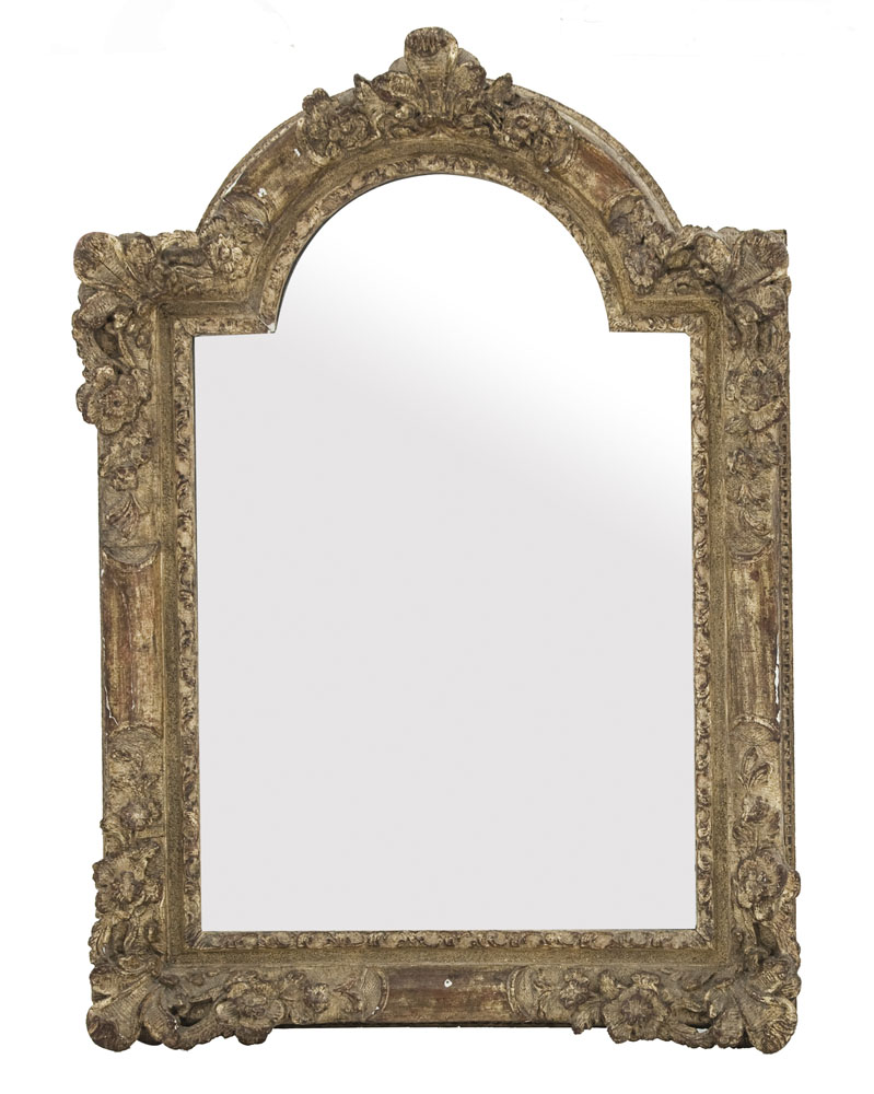 SPECCHIERA IN LEGNO DORATO, FRANCIA, XIX SECOLO, sagomata con angoli a fiori e foglie; sbeccature.
