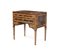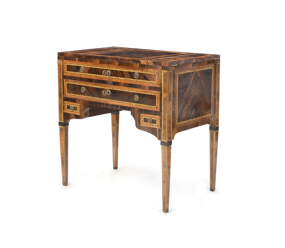 TOILETTE LUIGI XVI INTARSIATA, XVIII SECOLO, fronte a cassetti e piano tripartito apribile, gambe a obelisco, decoro ad intarsio in legni vari a formare riserve geometriche; restauri, mancanze e usure.