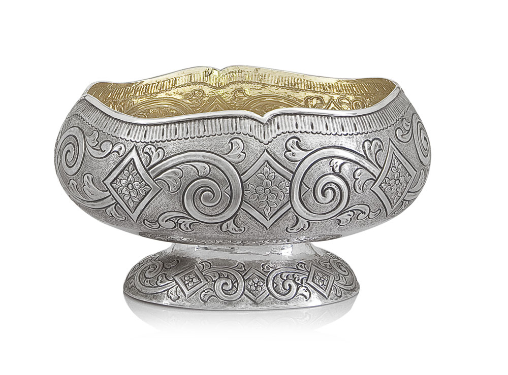CENTROTAVOLA IN ARGENTO, XX SECOLO, a coppa ovale con interno vermeil, decori a sbalzi floreali e volute.