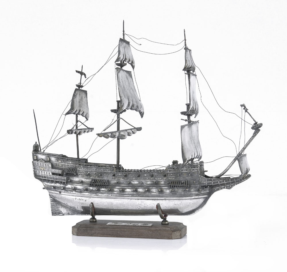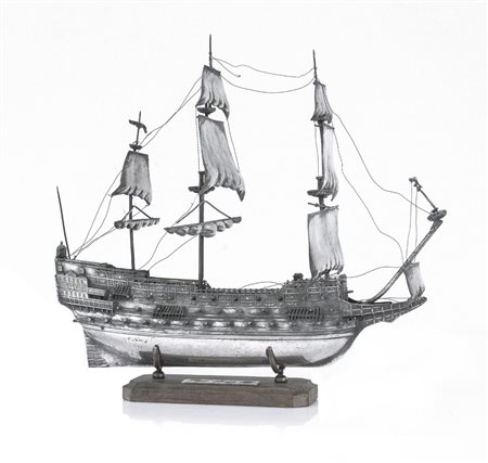 VELIERO IN ARGENTO, XX SECOLO, a tre alberi su base in legno; difetti.