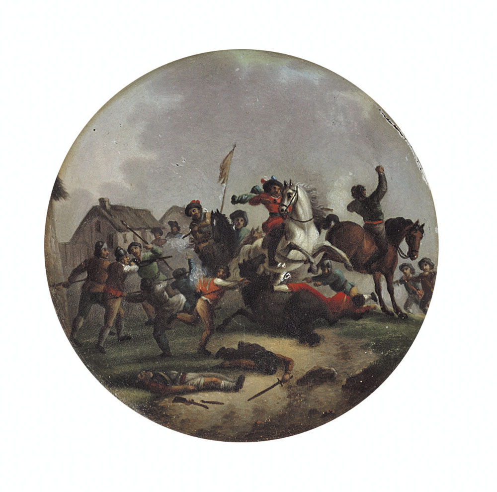 Lotto 621 | PITTORE DEL XIX SECOLO Scontro di cavalieri Miniatura su cartone circolare,...