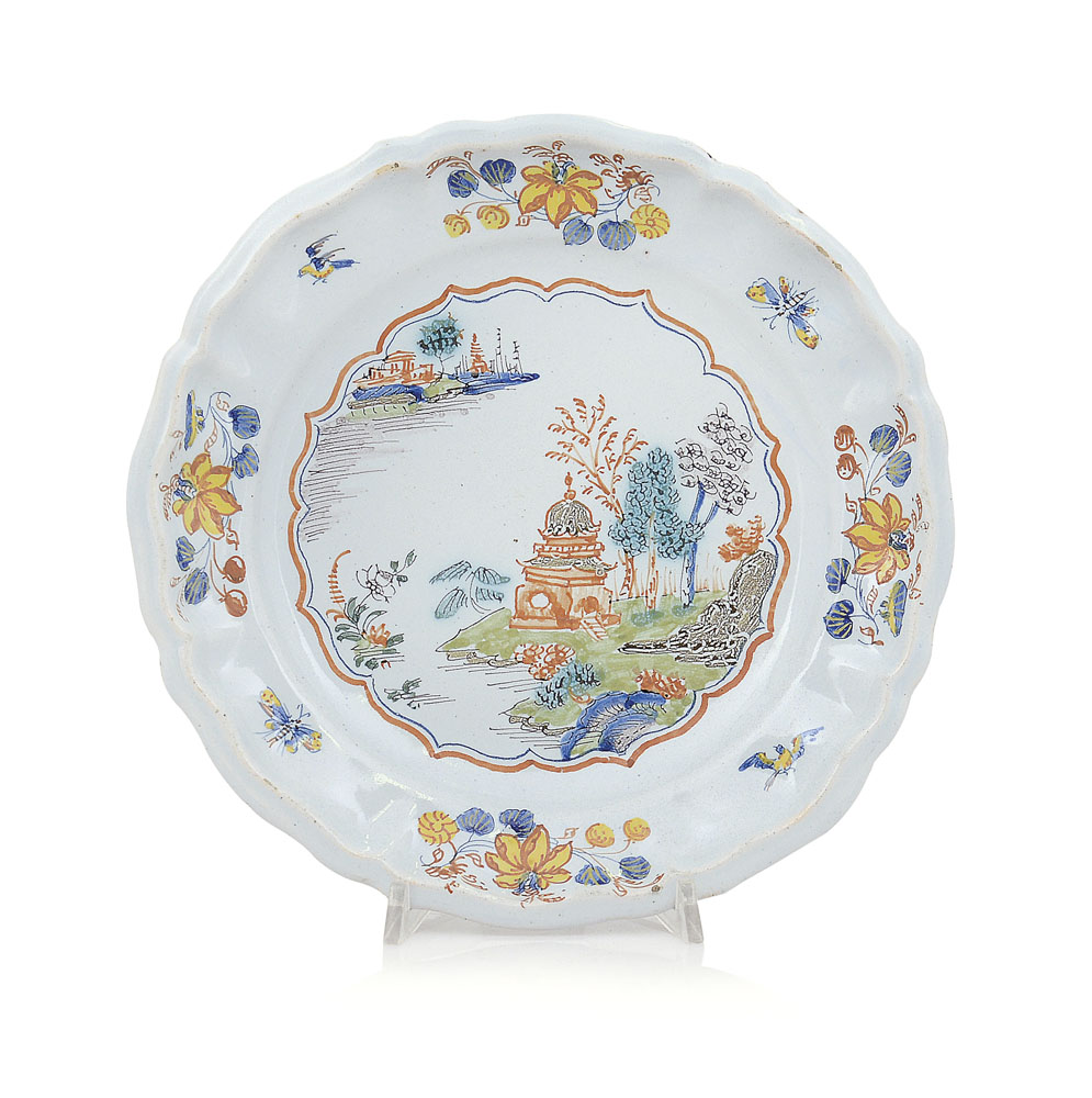 PIATTO IN MAIOLICA, FAENZA, FERNIANI, XVIII SECOLO, decoro policromo detto "al casotto".