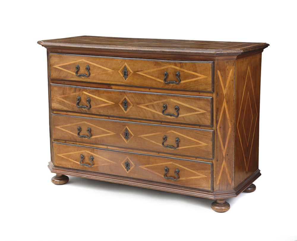 CASSETTONE IN NOCE, PIEMONTE, XVIII SECOLO, fronte a quattro cassetti, decori ad intarsio a losanghe di epoca successiva; usure e restauri.