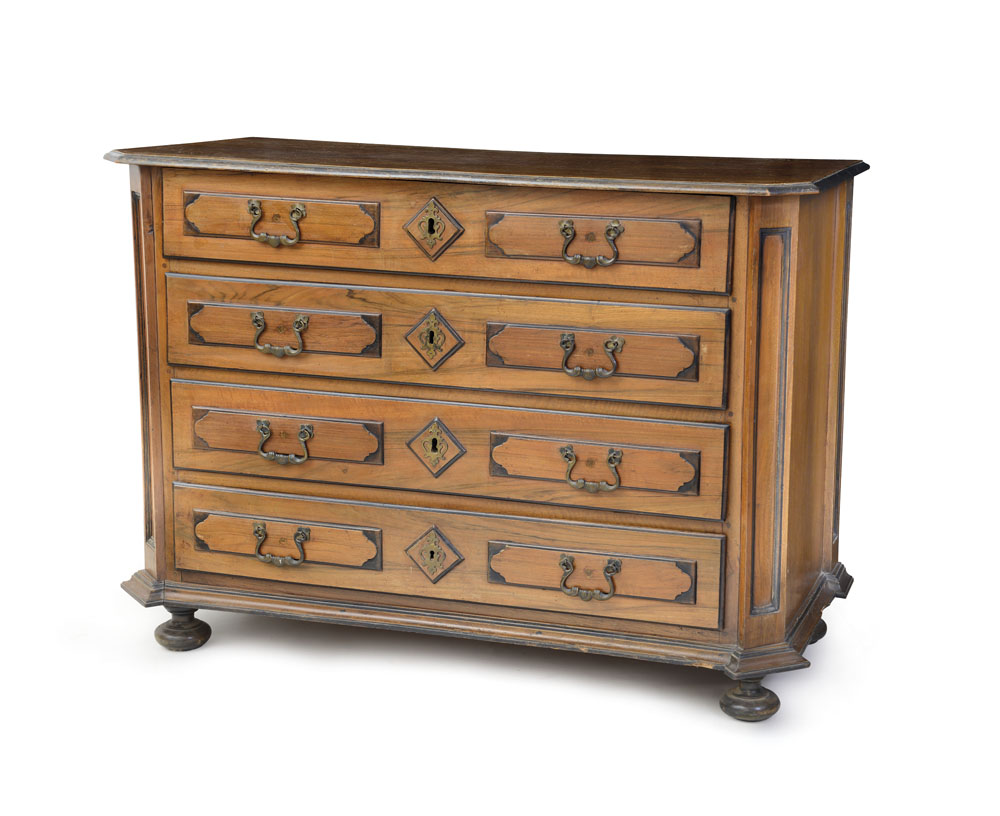 CASSETTONE IN NOCE, PIEMONTE, XVIII SECOLO, fronte a quattro cassetti con decori ad formelle a rilievo; usure e restauri.