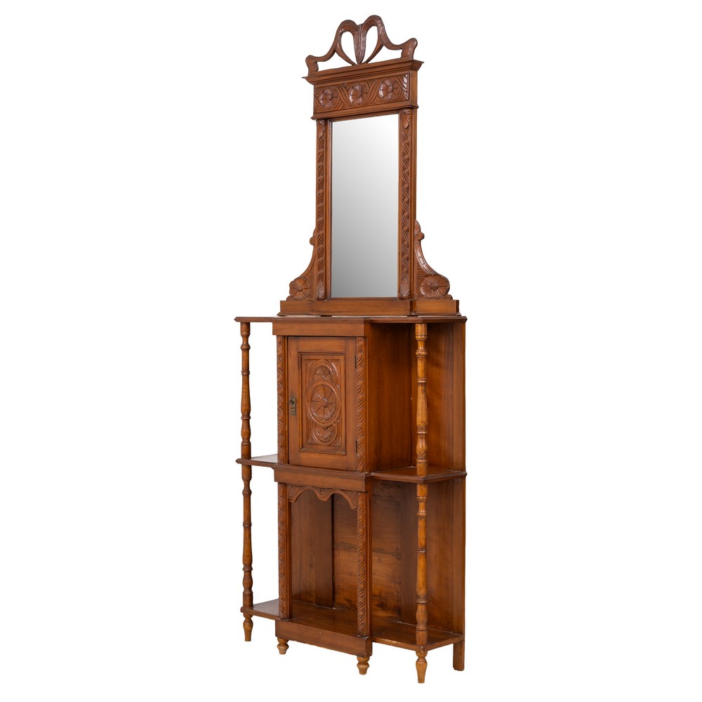 Etagere con specchiera in legno di noce, periodo umbertino.