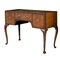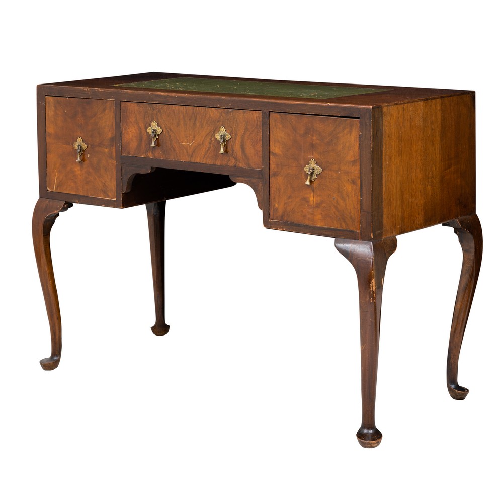 Scrittoio da muro a tre cassetti in legno di faggio e radica di noce, piano in pelle verde.