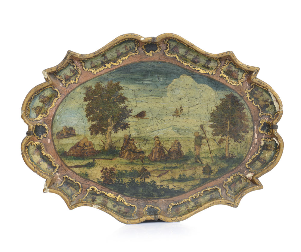 GRANDE VASSOIO IN LEGNO DIPINTO E LACCATO AD ARTE POVERA, XVIII SECOLO, bordo sporgente a profilo mistilineo, decori a figurette entro paesaggio e riserve; sbeccature e restauri.