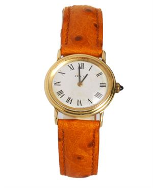 ZENITH Solo tempo in oro giallo anni '90 misura donna Diametro 31 mm Cassa ovale a gradini con sviluppo orizzontale, quadrante con indici a numerazione romana serigrafata, lancette a bastone smaltate. Movimento a carica manuale. An yellow gold only time 90's woman size