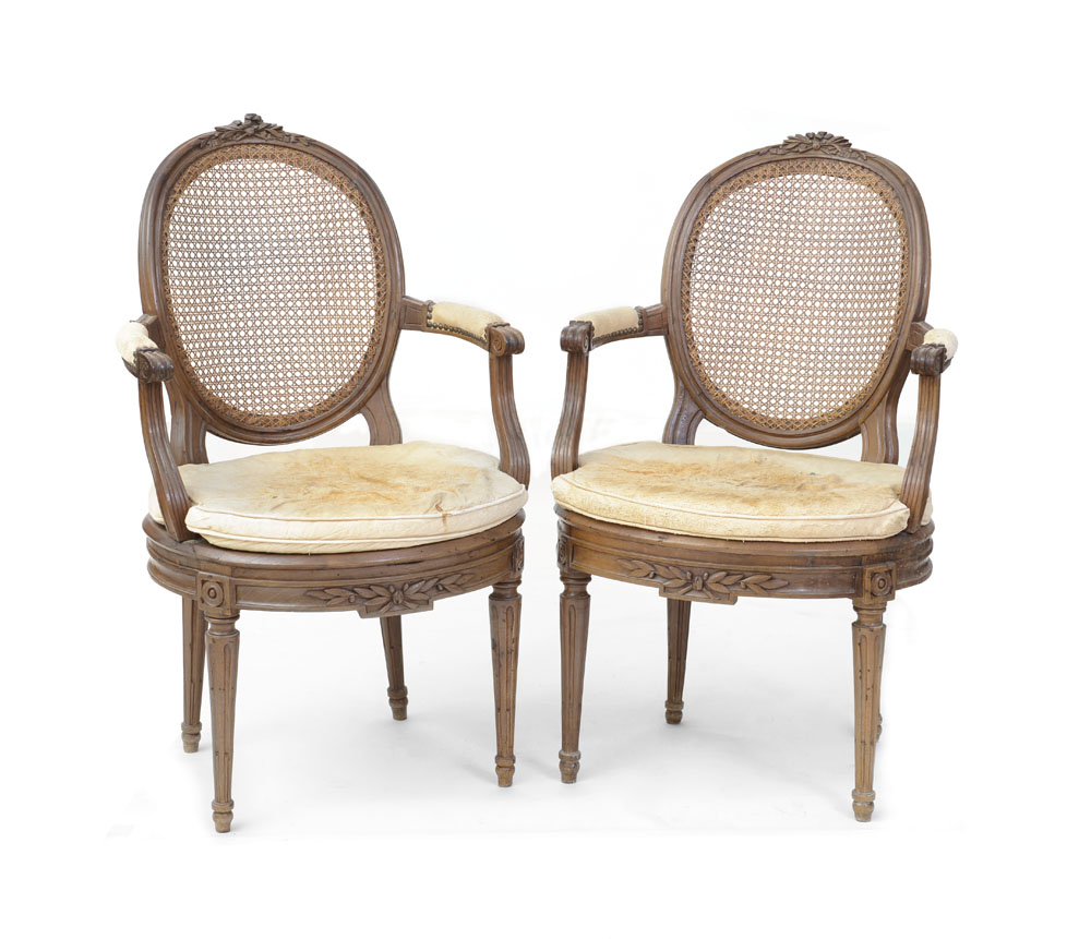 COPPIA DI POLTRONE LUIGI XVI IN NOCE, FINE XVIII SECOLO, schienali a medaglione con braccioli curvi e sostegni scanalati; restauri e usure.