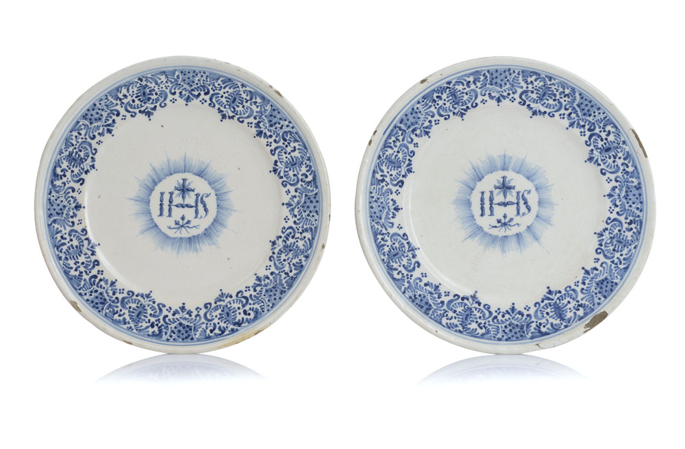 COPPIA DI GRANDI PIATTI IN MAIOLICA, TORINO, G.ROSSETTI, 1740 CA., decoro in blu centrato da "IHS" e croce entro raggiera, bordura con lambrequins alla Rouen; sbeccature.