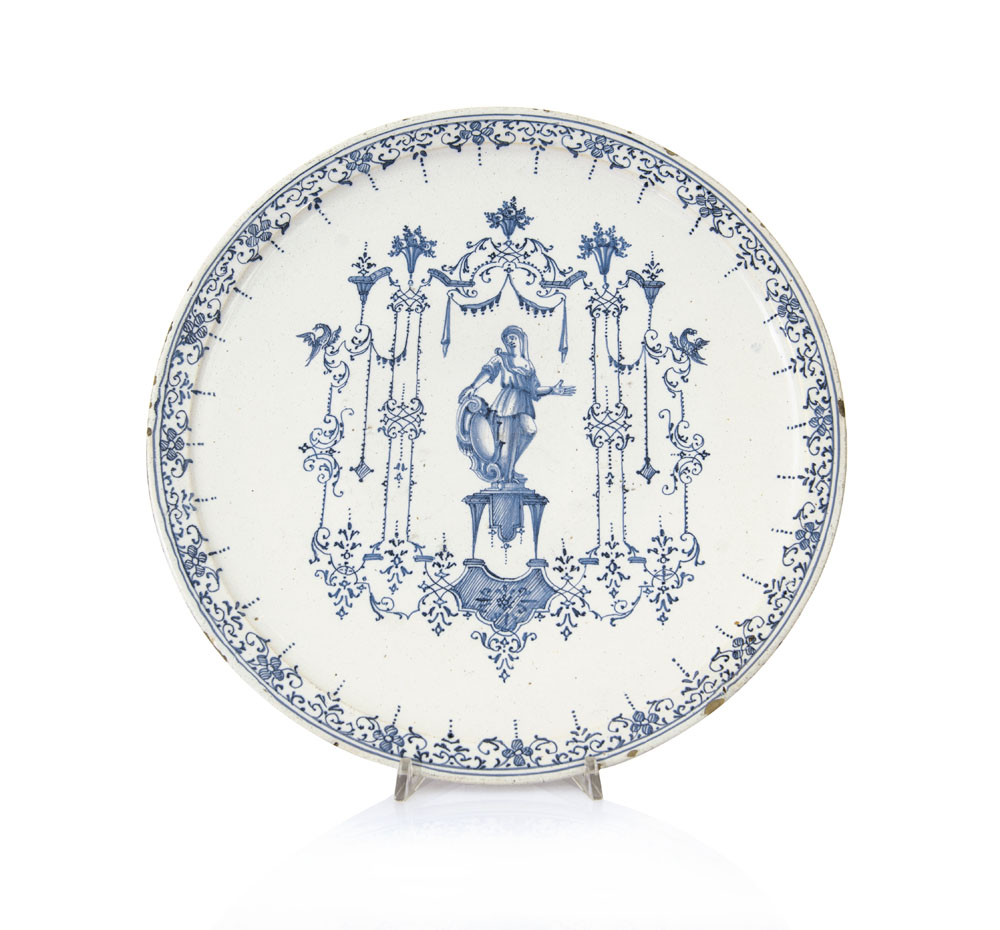 ALZATA IN MAIOLICA, LODI O TORINO, XVIII SECOLO, MANIFATTURA ROSSETTI, decoro in blu con figura allegorica entro festoni e fontane; lievi sbeccature.