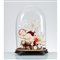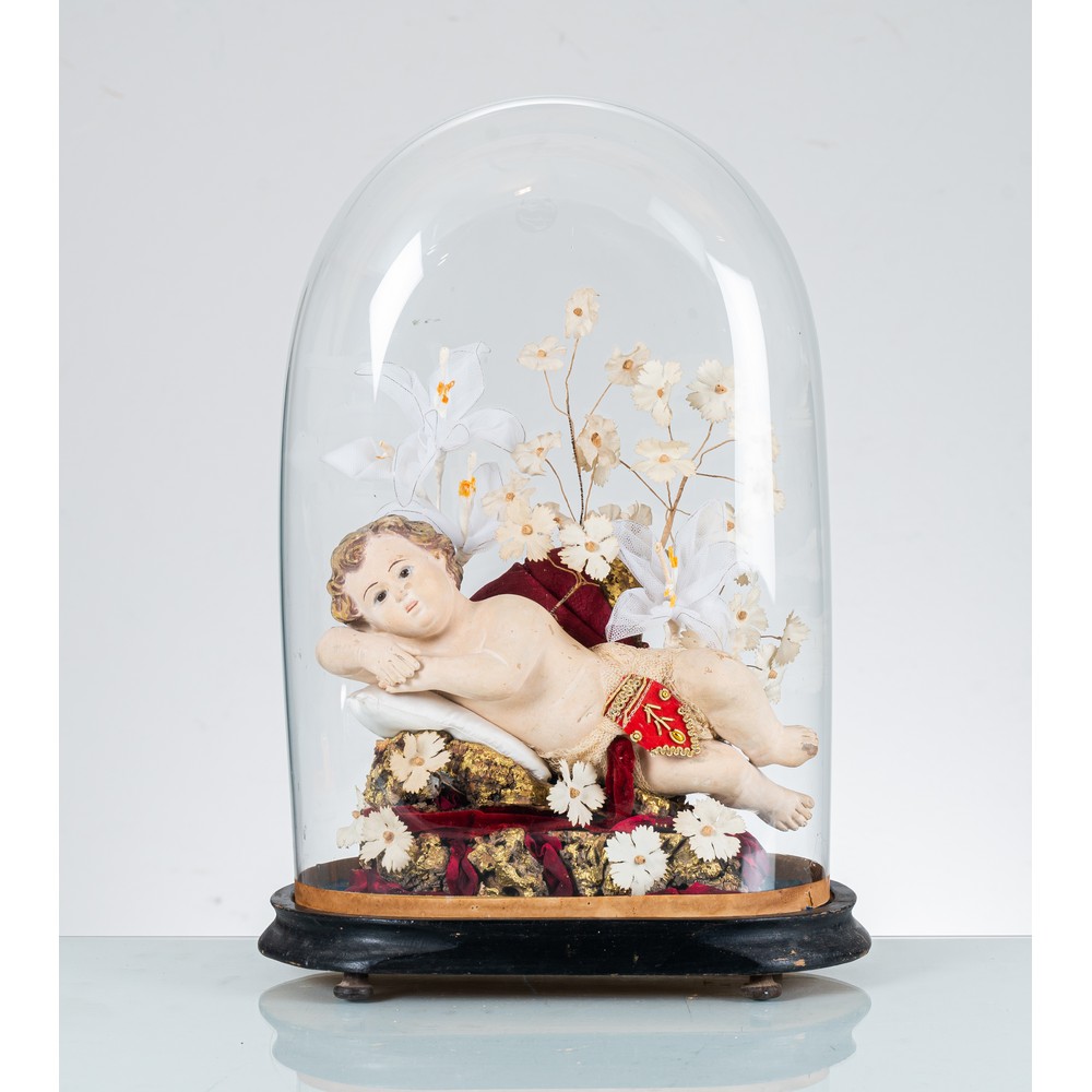 Bambinello in schiuma di gesso con fiori e decorazioni in carta, entro campana in vetro con base in legno ebanizzato.