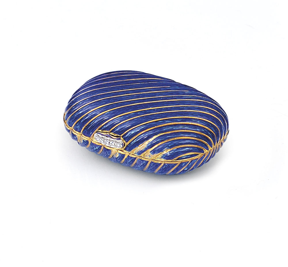 SCATOLINA PORTAPILLOLE IN ORO GIALLO, XX SECOLO, decoro a settori in smalto blu e chiusura in brillanti; lievi usure.