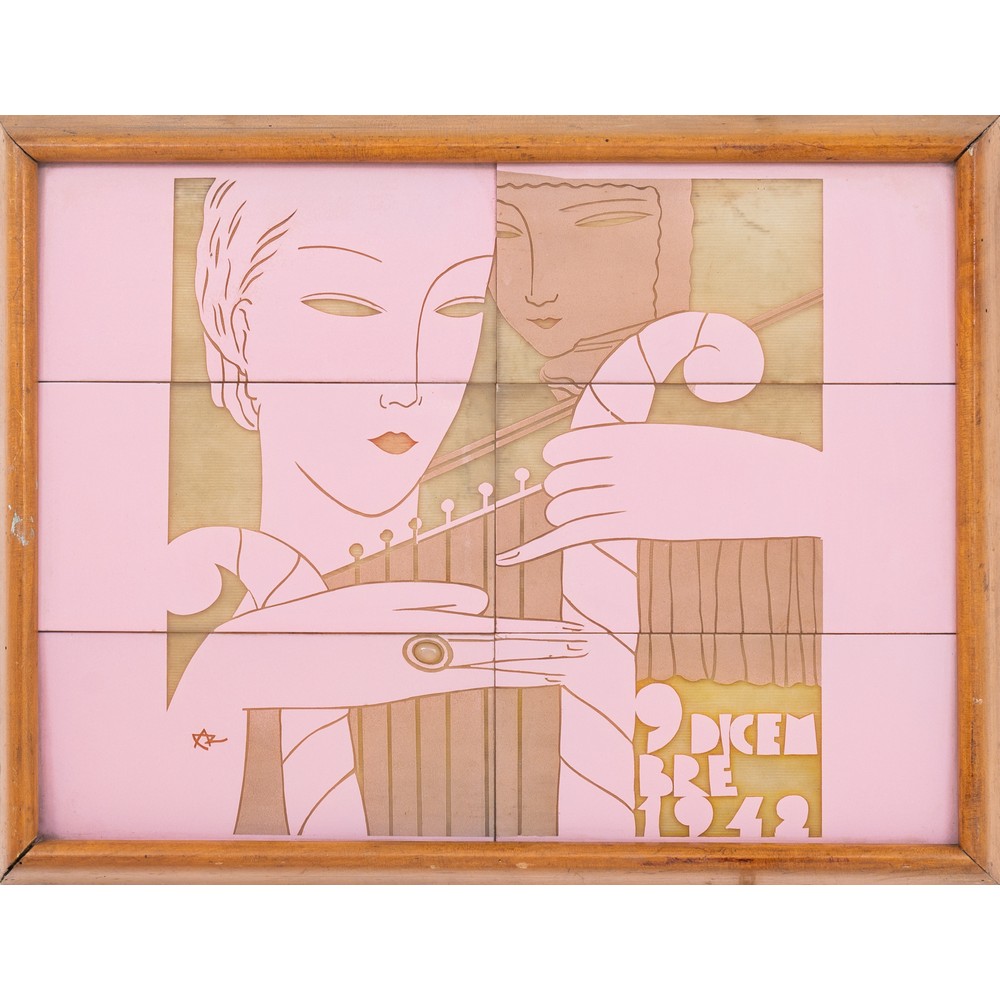 Pannello decorativo in stile Artdecò realizzato con sei elementi vitrei raffigurante "Figura femminile che suona l'arpa" con la stella di Davide e la dicitura 9 Dicembre 1942.