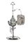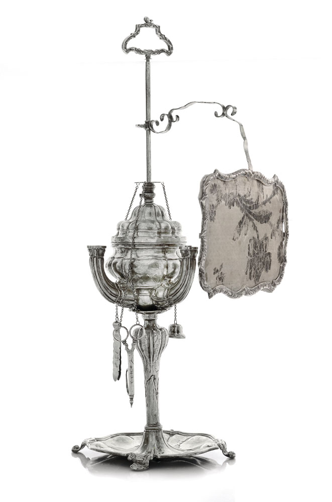 LUCERNA IN ARGENTO, PALERMO, XVIII SECOLO, base mistilinea su piedini, fusto e corpo percorso da nervature, doppio beccuccio costolato, sostegno cimato da presa a cui si aggancia la ventola sagomata, tre accessori pendono da catenelle.