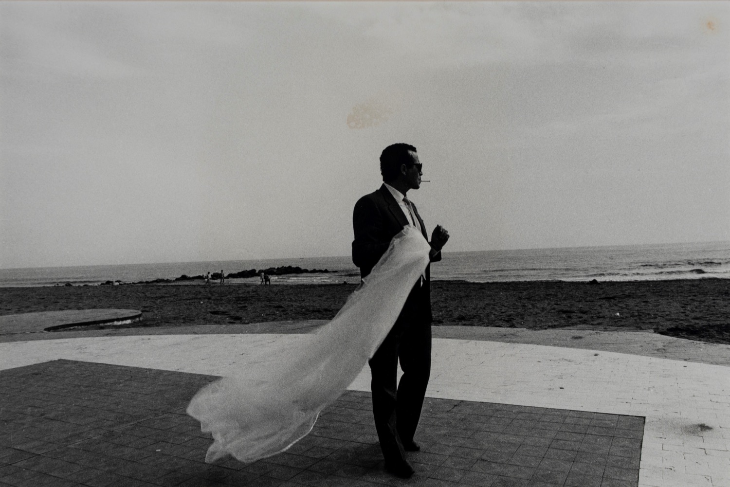 Antonio Biasucci (1961) - Castel Volturno. Uomo con velo da sposa passeggia in riva al mare, 1985