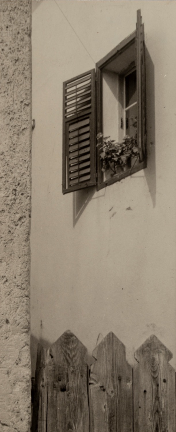 I punti di riferimento culturali di Vender sono numerosi e vanno dalla fotografia tedesca degli anni ’20 al Pittorialismo con un occhio rivolto, anche se in modo non dogmatico, a quell’idea ispirata all’estetica crociana dell’accurata stampa in high key, dominata cioè dai toni chiari. Sono esattamente questi a caratterizzare le due piccole stampe realizzate come auguri di buon anno (nel mondo anglosassone il termine in uso è Christmas card) per l’anno 1951. Qui i soggetti sono una casa la cui facciata diviene lo spazio che il fotografo utilizza per mettere in sintonia la finestra in alto e la staccionata in basso e il profilo di una chiesa che si staglia sullo sfondo, sovrastato dall’ampio spazio del cielo. In questo secondo caso siamo di fronte a un vero esercizio di stile in una stampa che gioca su tutte le sfumature del bianco attraversato dalle delicate increspature delle nuvole nel cielo e dai pochi punti neri che indicano la porta, due finestre e la campana della chiesa.