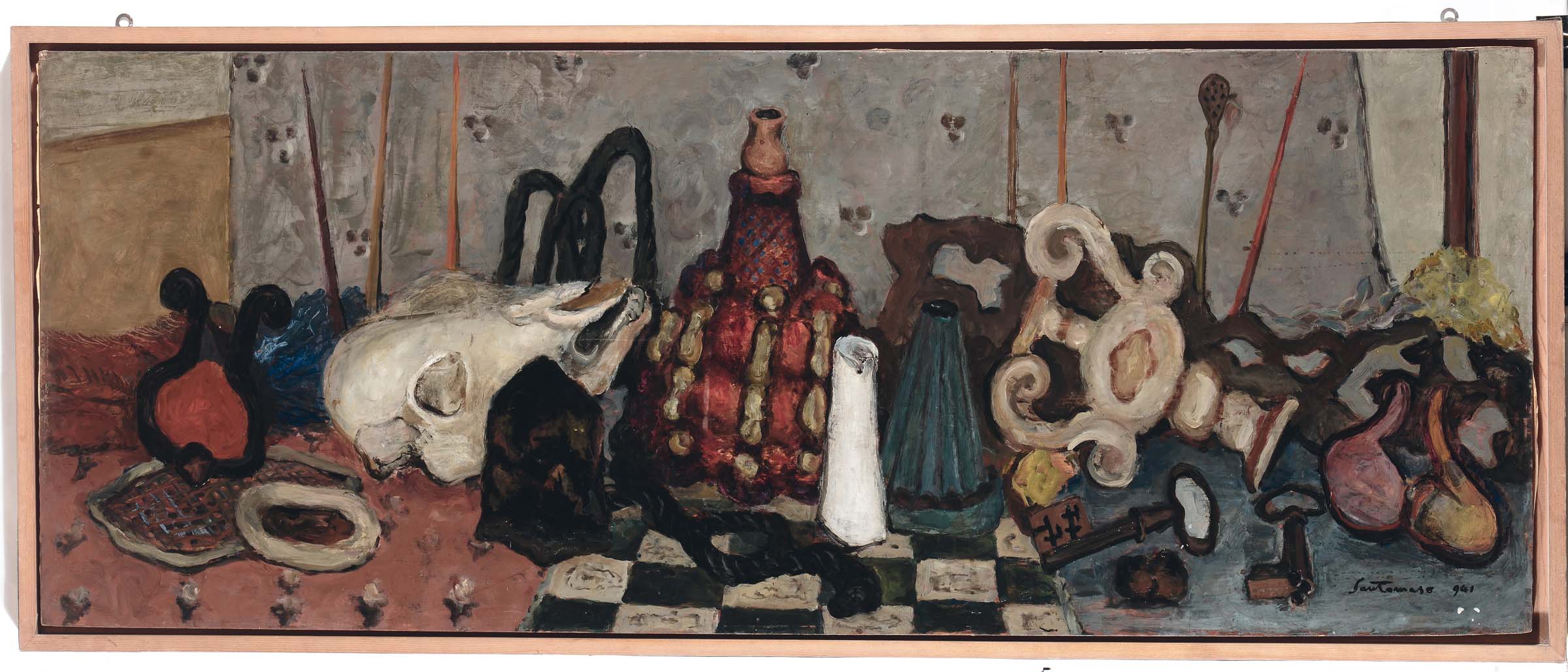 Giuseppe Santomaso (1907-1990), Natura morta con bucranio, 1941 olio su tavola, cm 50x150 firmato e datato in basso a destra, Pubblicato: Emporium, Rivista Mensile d’Arte e di Cultura, Maggio 1942 pag. 200 N. Stringa, Giuseppe Sartorio e l’opzione astratta, Marsilio, 2008, pag. 50-51 Esposizioni: III Premio Bergamo, Mostra nazionale della Pittura, Bergamo 1941, n. 156 p.51; Santomaso: Opere 1939-1982,Venezia 1982, tav. 3 p.18; Santomaso: Opere 1939-1986, Milano 1986 tav. 3 pag. 16; SAntomaso: Oper 1939-1986, Ludwigshafen 1986, tav. 3 p.28; Ar te Italiana. Presenze 1900-1945, Palazzo Grassi,Venezia 1989, ill. p.566; G. Cortenova, Santomaso: il paesaggio della visione , Locarno 1990, tav. p. 37; Gli anni del Premio Bergamo. Arte in Italia intorno agli anniTrenta,Bergamo 1993-1994,tav.107 p.191. Bibliografia: A. Podestà, Mostra del Terzo Premio Bergamo, in “Domus”, a. XIX, n. 166, ottobre 1941, p.34, ill. p.31; R. Pallucchini, Bepi Santomaso, in “Emporium” , a. XLVIII, n.5, maggio 1942, ill. p. 200; R.Giani, Santomaso in “Cinema”, n. 311950, p. 47; G. Ballo, Dal Simbolismo alle opere moltiplicate, Roma 1964, tav. 361; L.Venturi, Pittori italiani d’oggi, Roma 1958, p. 61; Alfieri, 1975, n. e fig. 68, Santomaso: Opere 1939-1982,Venezia 1982, p.10 e tav. 2 p.18; Santomaso: Opere 1939.1986, Milano 1986, p.16; E. Steingraber, appunti sugli esordi artistici di Santomaso, in PerGiuseppe mazzoriol,“Quaderni diVenezia Arti”, 1, 1992, p.226; E. Steingraber, Santomaso, Milano 1992,tav.p.33;Gli anni del premio Bergamo.Arte in Italia intorno agli anniTrenta, Milano 1993, n. 107 p. 230; Il Premio Bergamo 1939-1942. Documenti lettere, biografie, Milano 1993, p.322; N. Stringa,Venezia, in La pittura nelVeneto.Il Novecento,I,Milano 2006,p.76;N.Stringa,Giuseppe Sartorio e l’opzione astratta,Marsilio,2008,pag.50-51