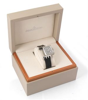 JAEGER LE COULTRE Cronografo Reverso modello "Gran Sport" serie recente. Misure 43 x 28 mm Cassa di forma tonneau in tre corpi doubleface incisa con scanalature trasversali reversibile di 180 gradi. Doppio quadrante, il primo con finitura guilloché quadrettata al centro e grené esterna con numeri arabi serigrafati. Particolare indicatore per lo stato di funzionamento del crono ad ore 5. Il secondo rifinito guilloché quadrettato con contaminuti retrogrado al 6 e contaminuti decentrato. Movimento a carica manuale calibro jaeger 859. Corredato di astuccio della Maison. A chronograph "Gran Sport" model recent series