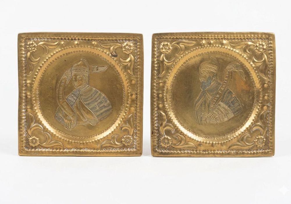 Coppia di placche quadrangolari con ritratti dei Dogi di Venezia Ottone sbalzato e inciso