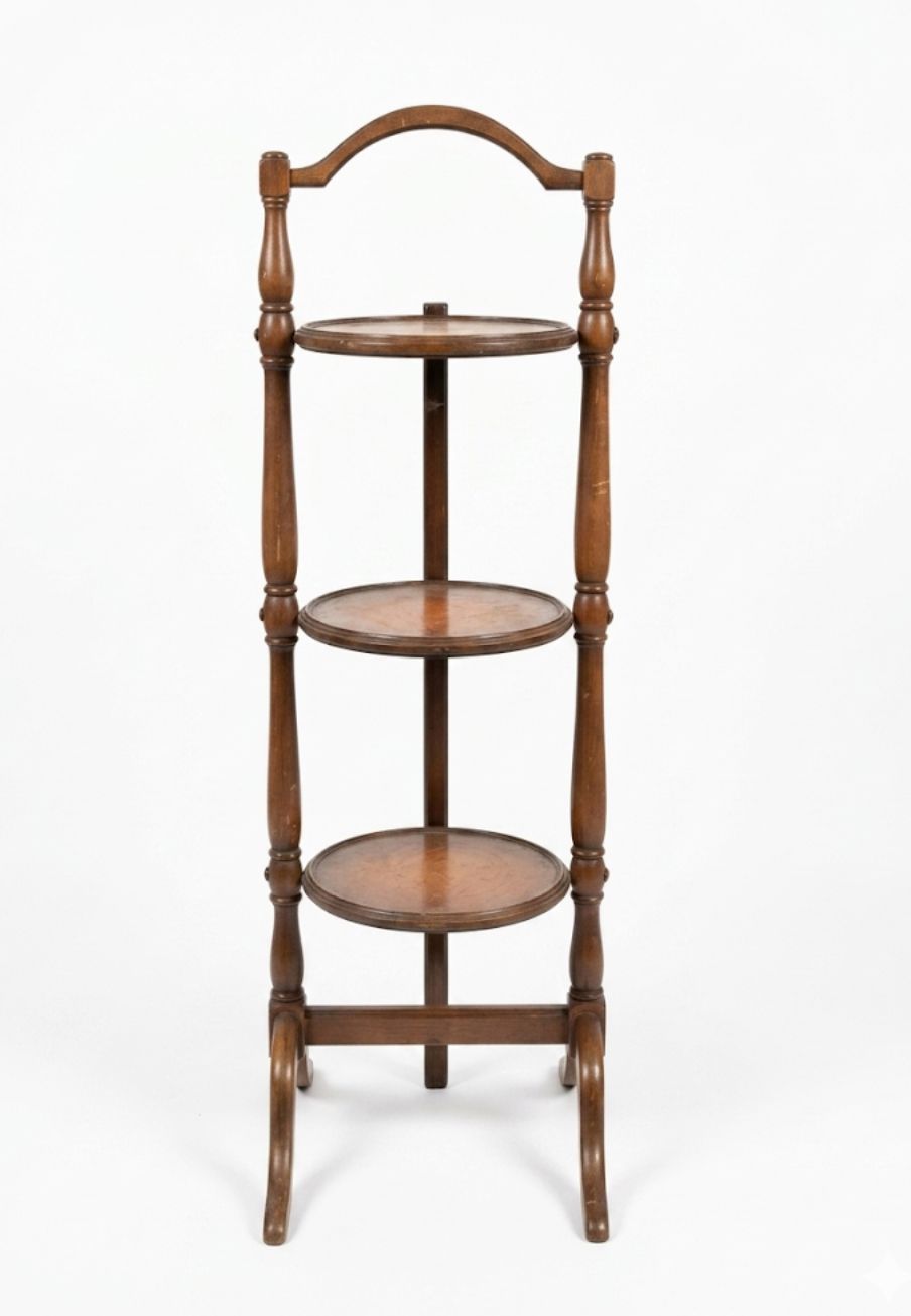 Elegante mobile d'appoggio a colonna, comunemente noto come "Dumbwaiter" (servitore muto), di gusto tipicamente inglese. La struttura è composta da tre ripiani circolari degradanti o di egual misura, sorretti da montanti laterali finemente torniti a balaustro.