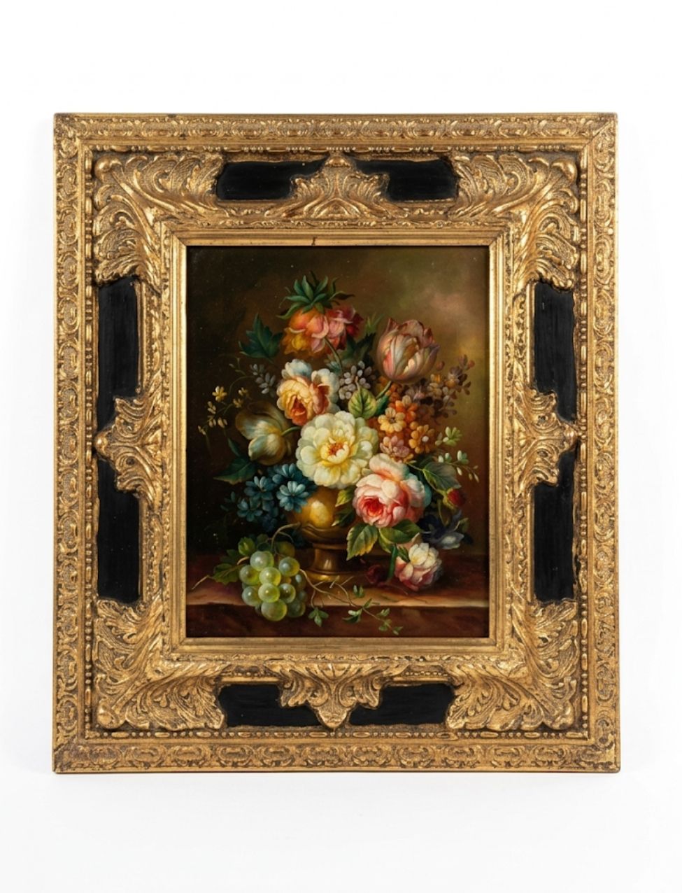 Natura morta con vaso di fiori e uva Olio su tavoletta, entro cornice decorata e dorata