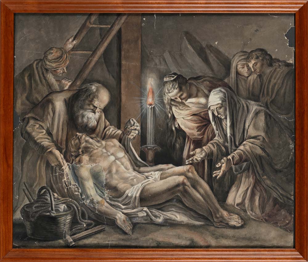 Scuola genovese del XVIII secolo Compianto su Cristo Inchiostri acquerellati su carta mm 340x400 - in cornice cm 37x43 L'opera replica un originale di Francesco Bassano il Giovane