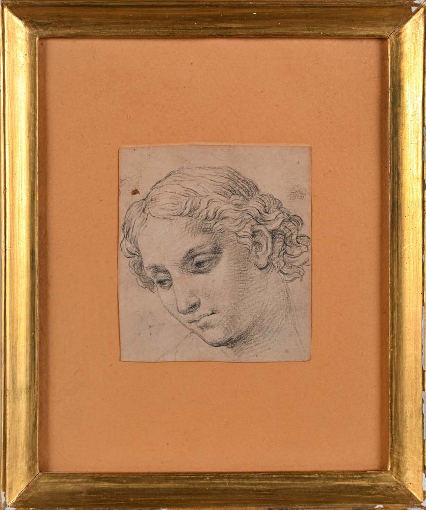 Scuola bolognese del XVIII secolo Studio di volto maschile Pietra nera con rialzi di gessetto bianco su carta mm 130x115 - con cornice cm 30x24,5