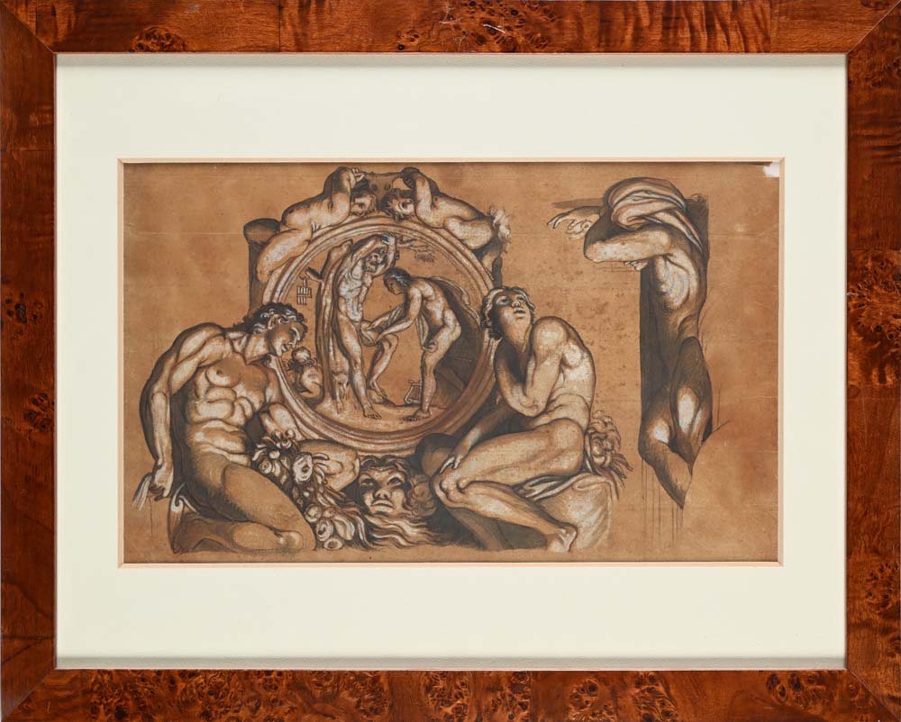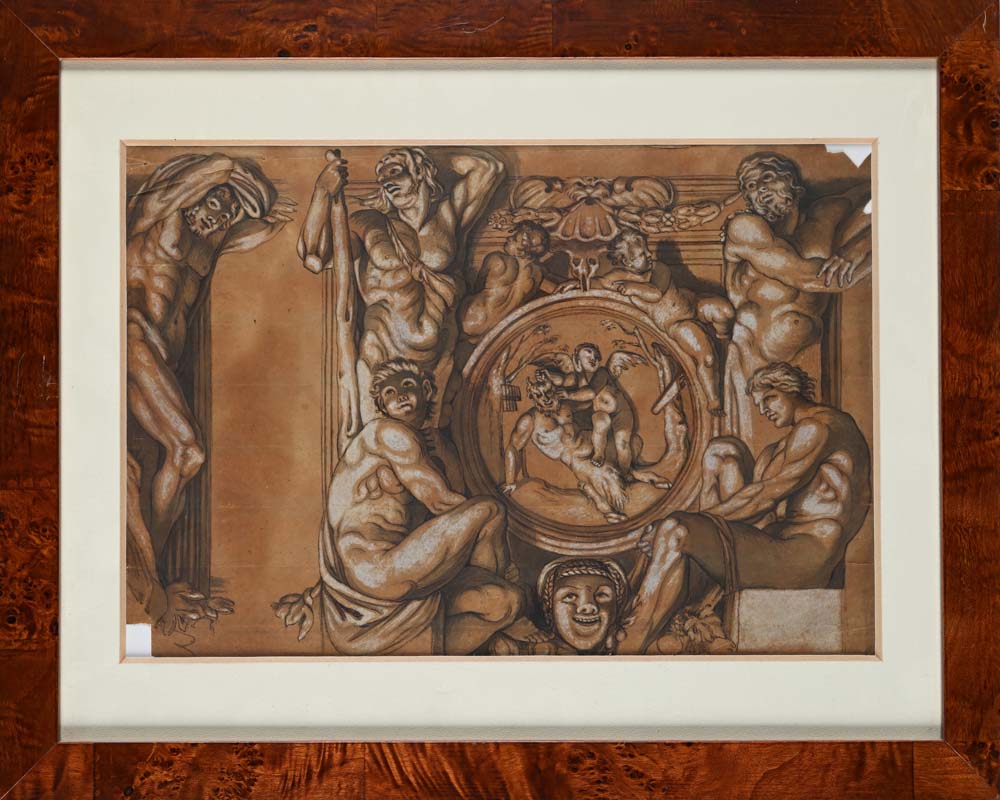 Scuola italiana del XVIII secolo Apollo e Marsia - Omnia vincit Amor Penna, inchiostro bruno, inchiostri acquerellati con rialzi in biacca su carta nocciola mm 220x360 - con cornice cm 39x49; mm 260x370 - con cornice cm 39x49 I disegni replicano gli affreschi del fregio di Palazzo Farnese a Roma dipinti da Annibale Carracci