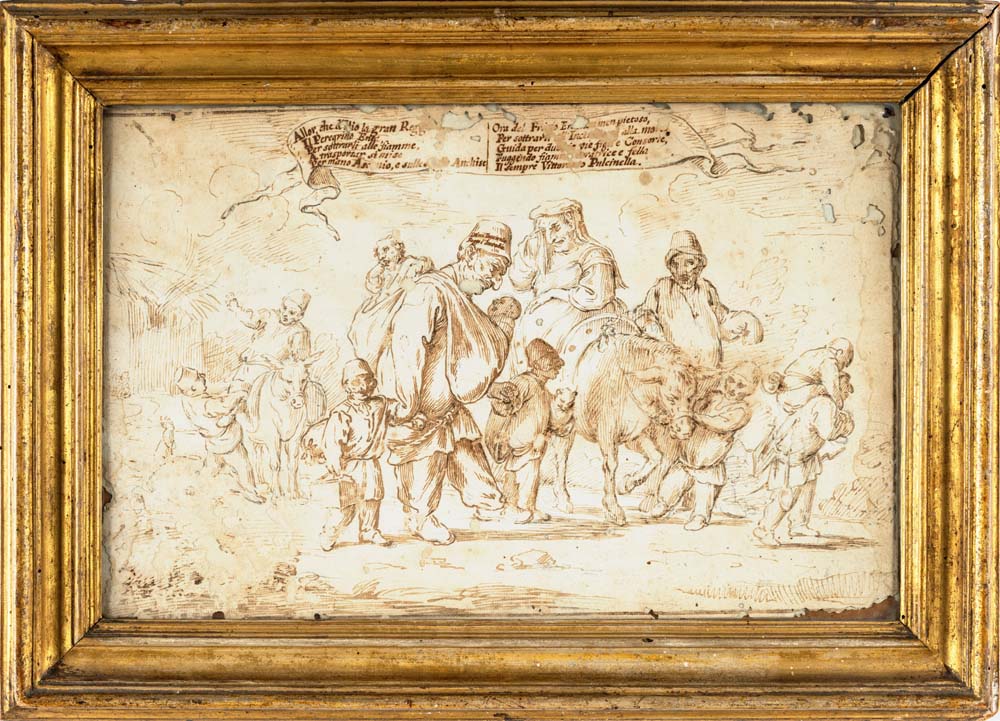 Pier Leone Ghezzi Studio per Pulcinella fugge dalla casa in fiamme inchiostro bruno su carta mm 270x410 - con cornice cm 38x50