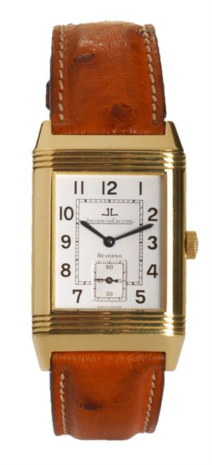 JAEGER LE COULTRE Reverso Grande Taille in oro giallo Misure 43 x 26 mm Cassa di roma rettangolare incisa con scanalature trasversali reversibile con possibilità di rotazione del corpo centrale. Quadrante argenté con indici a numerazione araba e minuteria a binario, lancette a gladio in acciaio azzurrato. Movimento a carica manuale calibro 822 An yellow gold Reverso Grande Taille