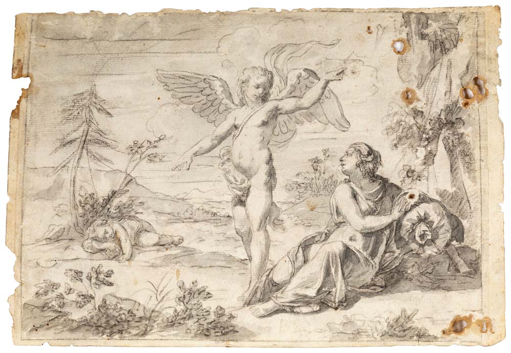 Adeodato Malatesta Agar e l'Angelo Pietra nera, penna e inchiostro acquerellato grigio su carta mm 175x255 Firmato e datato sul verso "Quadro di Adeodato Malatesta. Putto. Anno 1846 A. Malatesta"