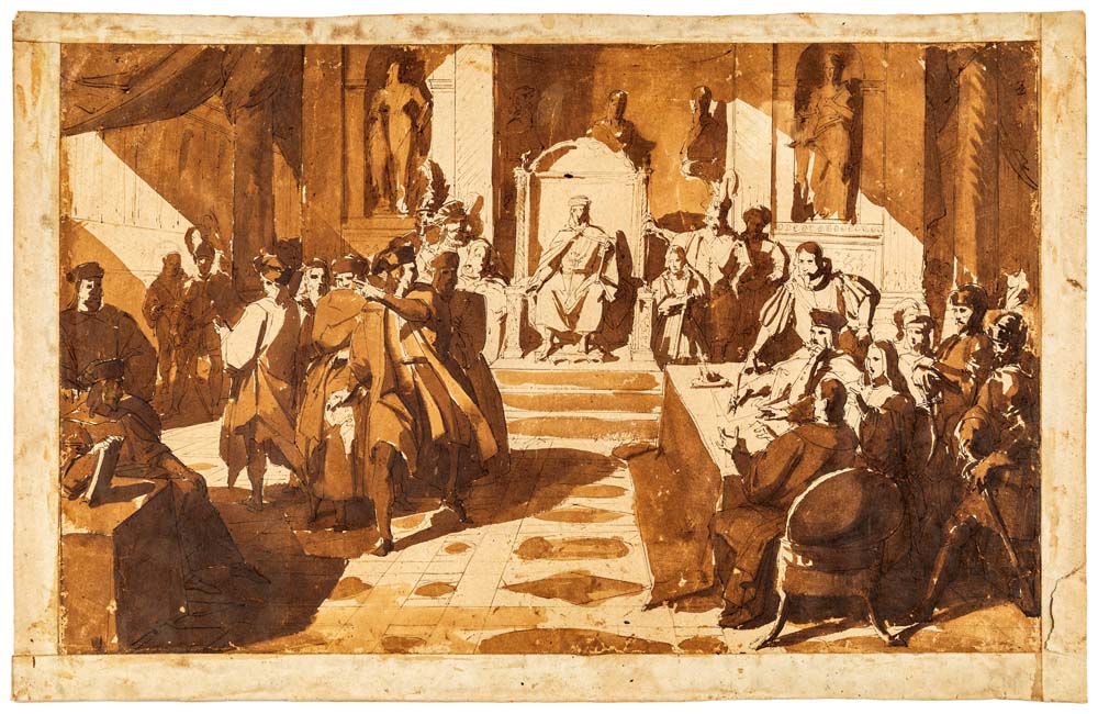 Scuola Italiana del XIX secolo Colombo alla corte di Ferdinando il Cattolico Penna, inchiostro bruno, inchiostro acquerellato, china e pietra nera su carta mm 380x600 - con passe-partout cm 51x71
