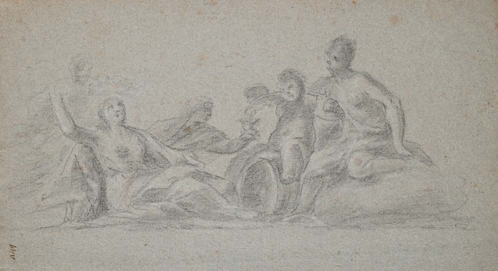 Scuola Lombarda del XVIII secolo Recto: Studio di nudo accademico - Verso: Studio di scena mitologica Pietra rossa, pietra nera con rialzi di gessetto bianco su carta azzurra mm 380x220