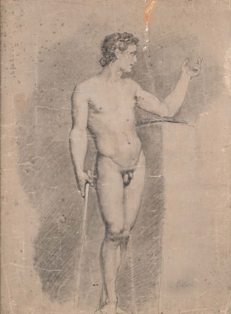 Scuola neoclassica italiana Nudo maschile con bastone pietra nera su carta mm...