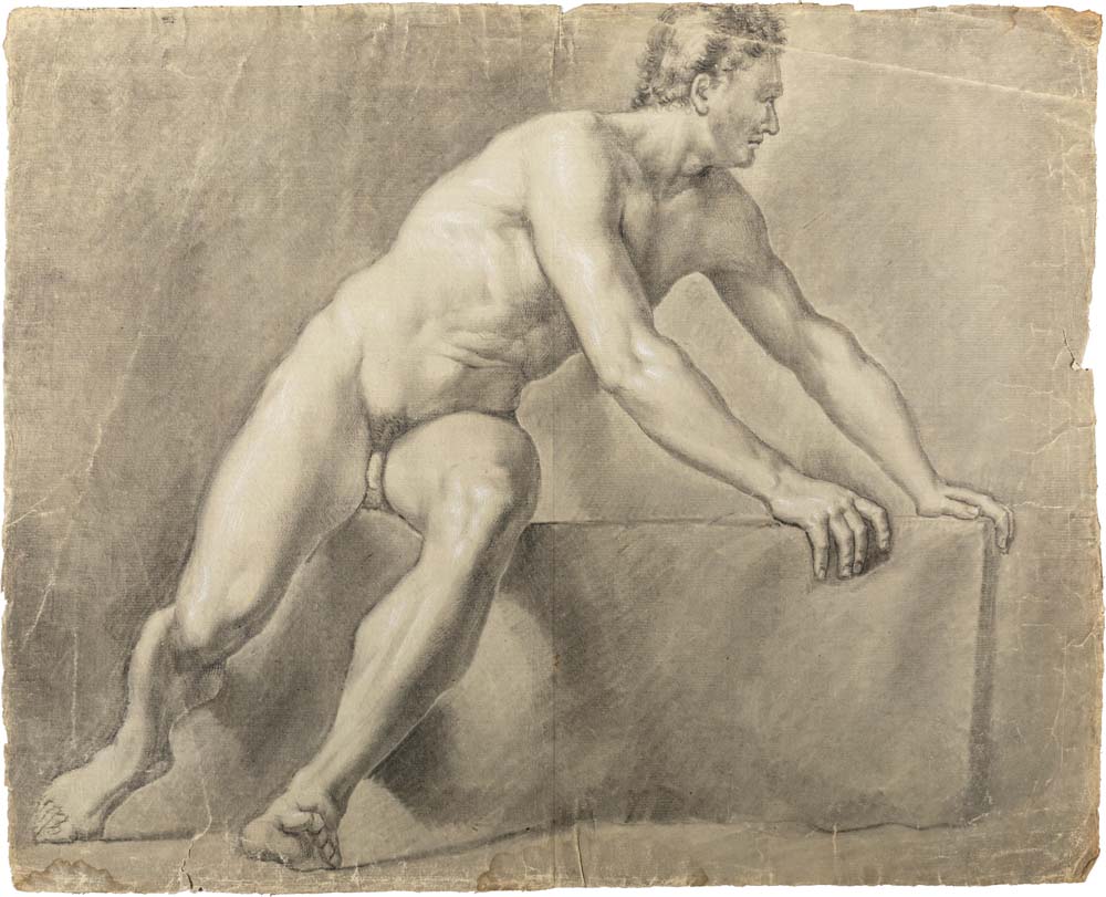 Scuola neoclassica italiana Studio di nudo accademico seduto carboncino, pietra nera e rialzi a biacca su carta nocciola mm 465x585