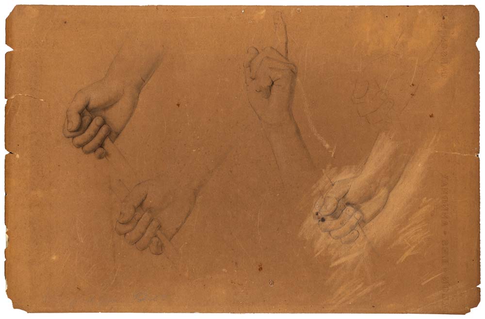 Scuola Italiana del XIX secolo Studi di braccio e mani Pietra nera su carta nocciola mm 310x480 Firmato in basso a sinistra "Studio fatto al Guzzola P. Bidosti"