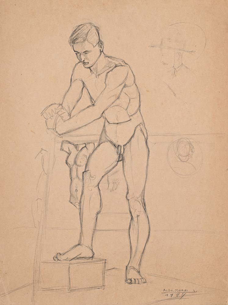 Aldo Marzi Studio di Nudo con profilo di gentiluomo col cappello Matita su...