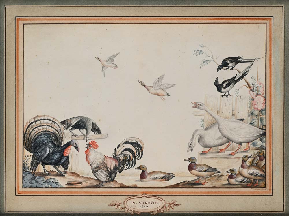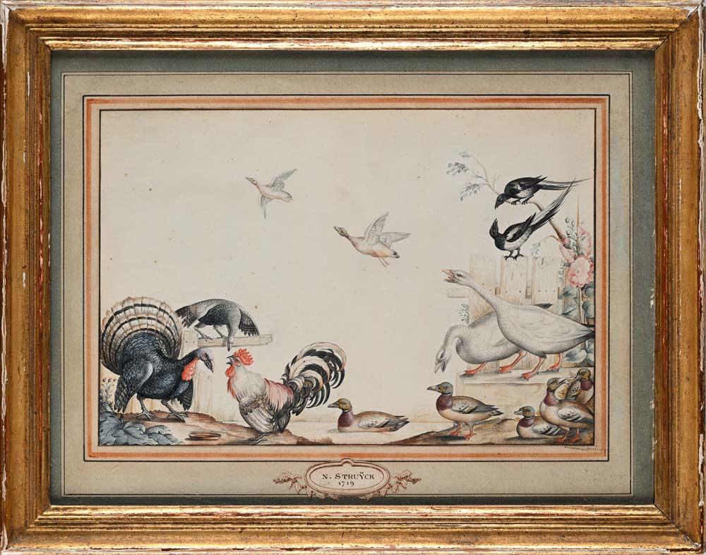 Nicolaas Struyk Veduta con uccelli acquatici e fiori Penna, inchiostro e acquerelli su carta mm 220x310 - con cornice cm 36x45 Iscritto e datato in basso al centro "N. Struyck 1719"