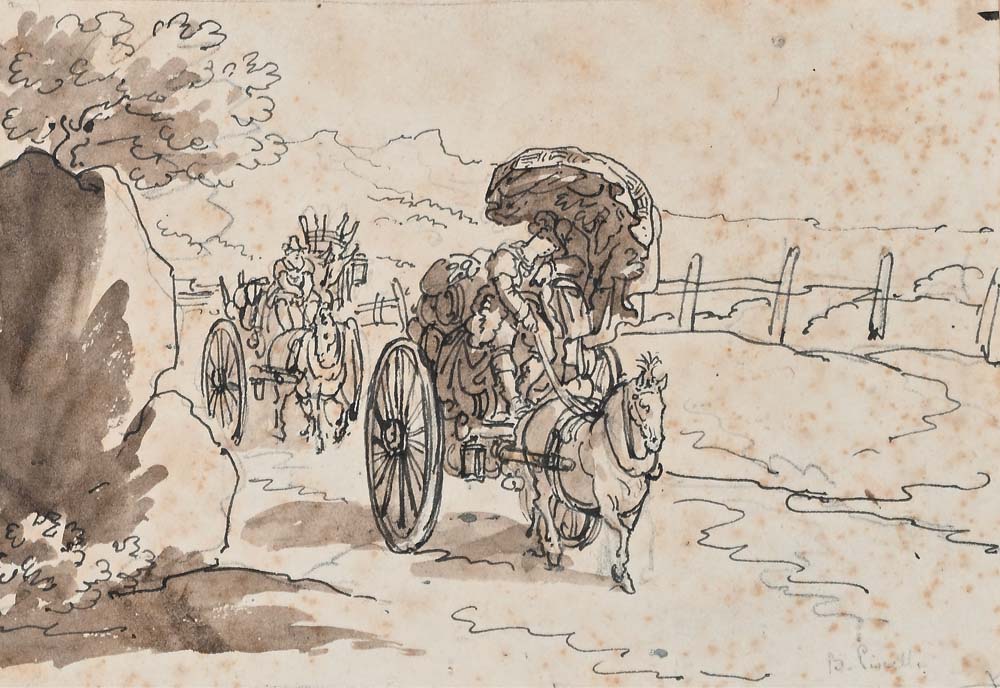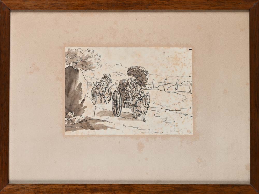 Scuola neoclassica italiana Veduta con carrozze nella campagna Penna, china, inchiostro bruno acquerellato e matita su carta mm 130x190 - in cornice cm 29x39 Iscritto in basso a destra "B. Pinelli"