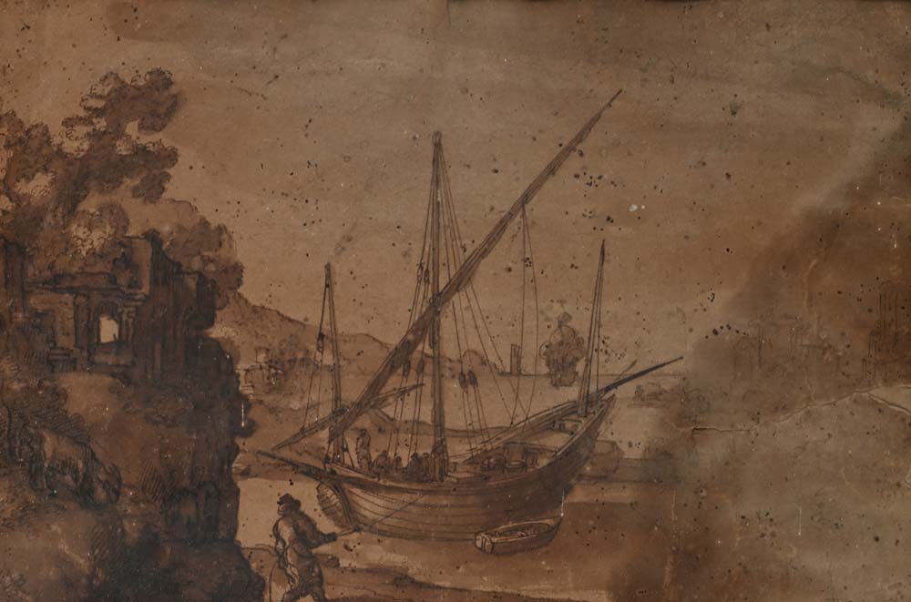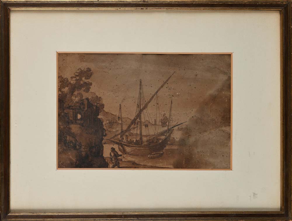 Scuola romana del XVII/XVIII secolo Studio di barche e figure penna e inchiostro bruno, pennello e inchiostro acquarellato e pietra nera su carta mm 20x290 - con cornice cm 37x50