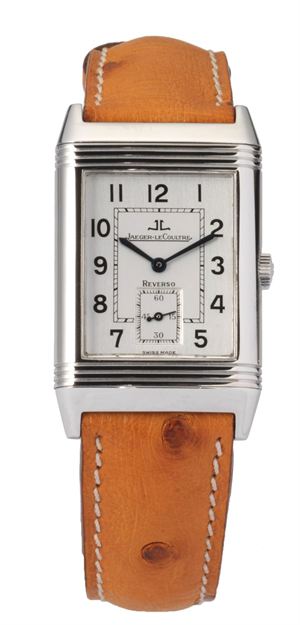 JAEGER LE COULTRE Reverso Grande Taille in acciaio serie contemporanea 43x26 mm Cassa in acciaio di forma rettangolare incisa con scanalature trasversali reversibile con possibilità di rotazione del corpo centrale, quadrante argentè con indici e numeri arabi e minutaria a binario, lancette a gladio in acciaio azzurrato. Movimento a carica manuale calibro 822. Completo di scatola e manuali. Reverso Grande Taille steel contemporary series